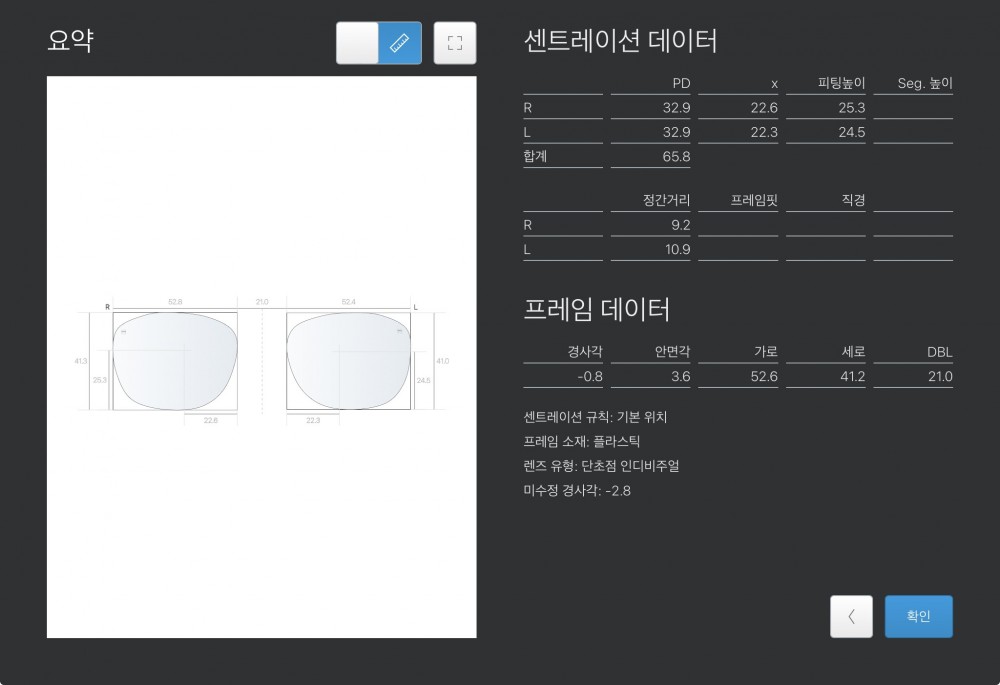 | 도수(-R) | -1.50 -1.50 70 | 도수(-L) | -2.00 -1.50 105 |