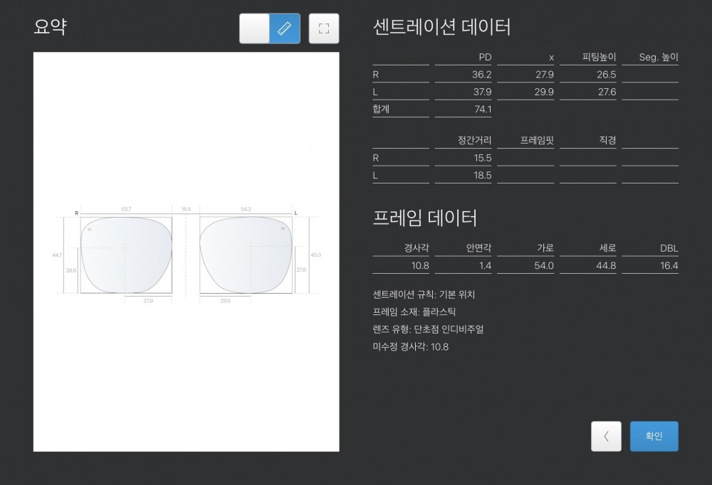 | 도수(-R) | +0.50 -0.50 180 | 도수(-L) | +2.25 -2.25 20 |