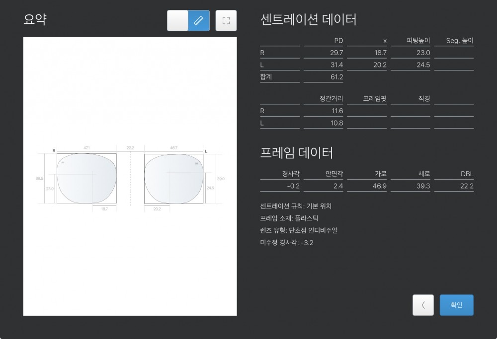 | 도수(-R) | -3.75 -0.25 10 | 도수(-L) | -3.75 -0.75 155 |